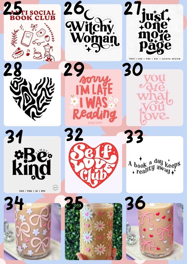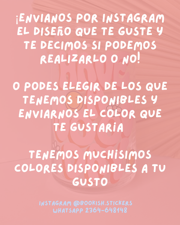 Vaso de vidrio de 450ml, para bebidas frías o calientes, viene con tapa de bamboo y sorbete de vidrio. Podes seleccionar dentro de nuestros diseños que ven en las imágenes pero también podes pedirnos el diseño que más gustes, nos envías una foto a instagram a @bookish.stickers o nos escribís por whatsapp al 2364-648148 y nosotros te vamos a decir si es posible realizar el diseño! Tenemos todos los colores disponibles y el tiempo de realizado es un mínimo de 5 días! Se puede cobrar un extra de $2000 pesos si el diseño es más complejo! Pueden pedirnos también más ejemplos de diseños y les enviaremos un link al catalogo!